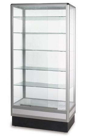 die cast aluminum frame – available in silver or black – lock included – tempered glass – rounded corners – 5 adjustable shelves – sliding doors – 6" black kick plate-lock and levels-lighting available by request - ships case packed ready for assembly - assembly available on request – toll free 1-866-400-1644